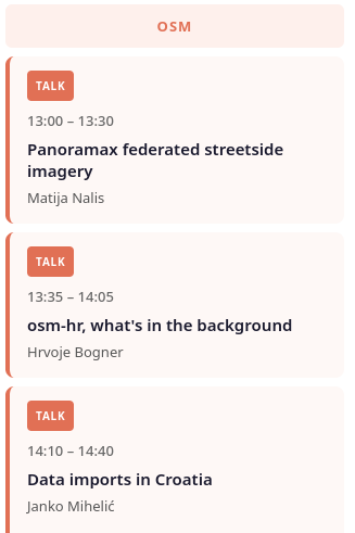 Termini predavanja su objavljeni na webu. Imamo 3 seta predavanja a za njima slijedi sesija za lightning talkove gdje će entuzijasti na brzinu demonstrirati neke projekte na kojima rade, a koji koriste OSM podatke.